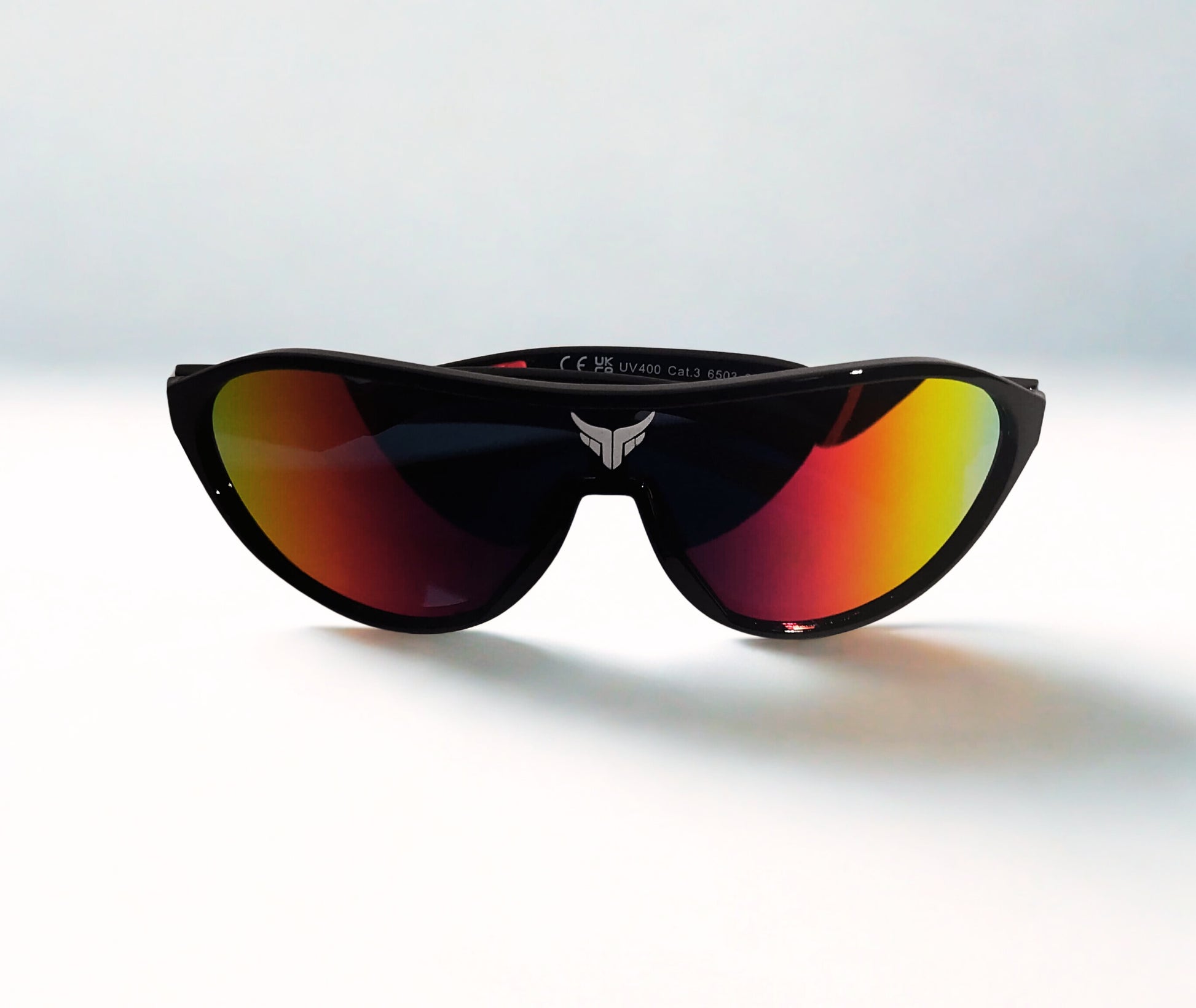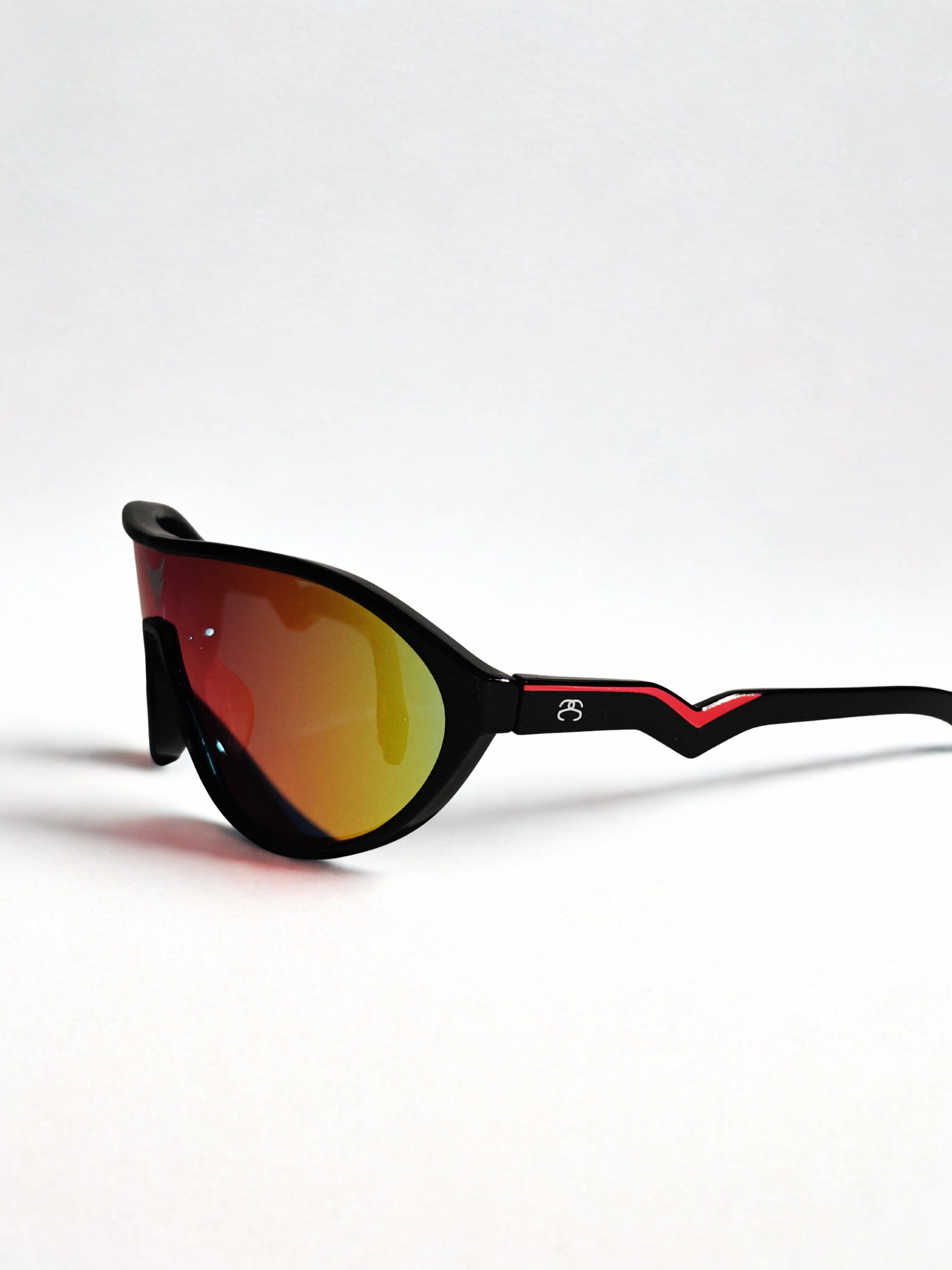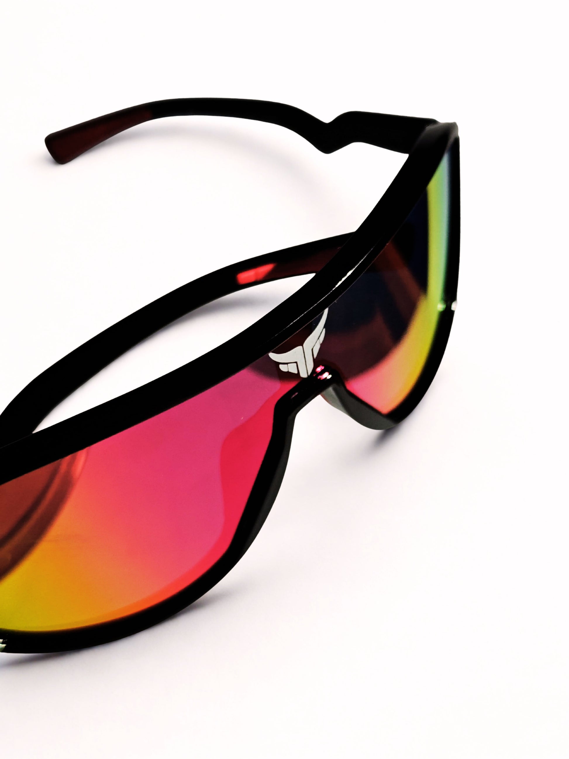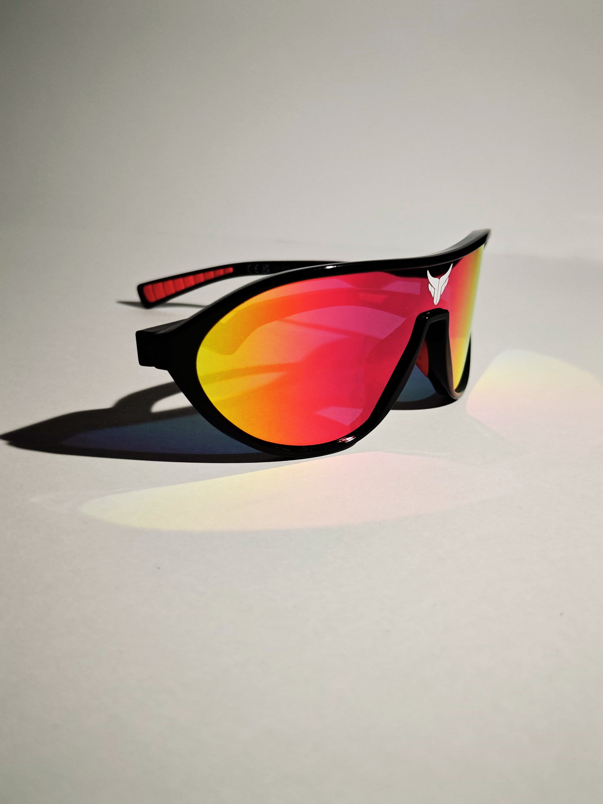 Gallardo es pura adrenalina vestida de fuego. Su lente espejo iridiscente en tonos rojos y dorados arde con cada movimiento, mientras la curvatura aerodinámica envuelve la mirada con agresividad refinada. Inspiradas en la sangre caliente del toro bravo, estas gafas no piden permiso: irrumpen.