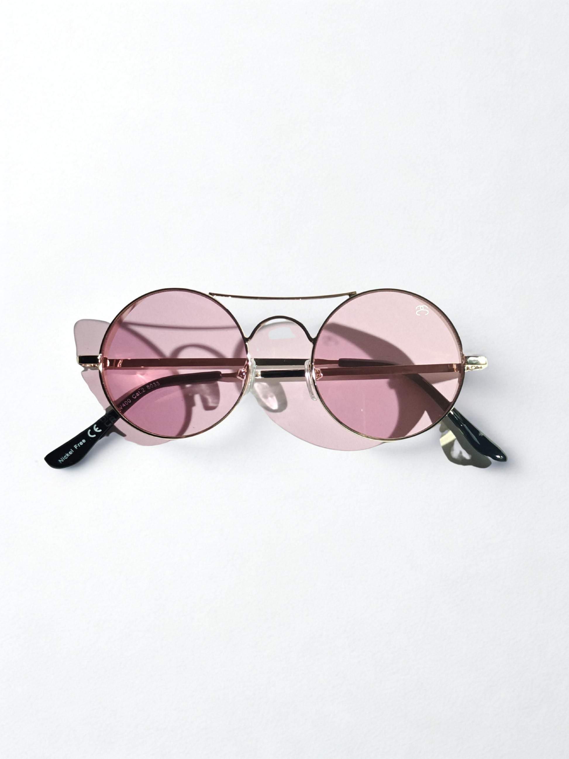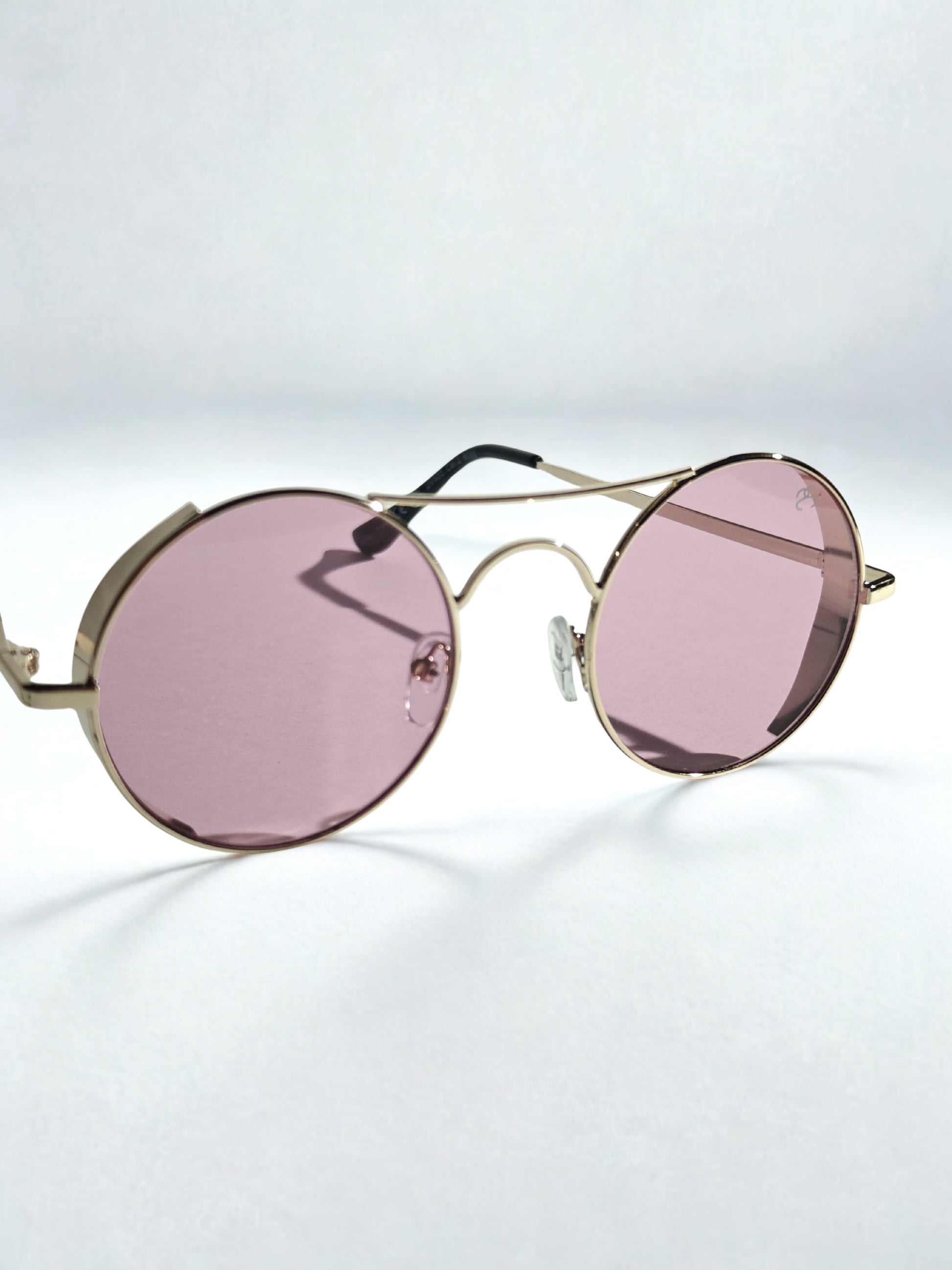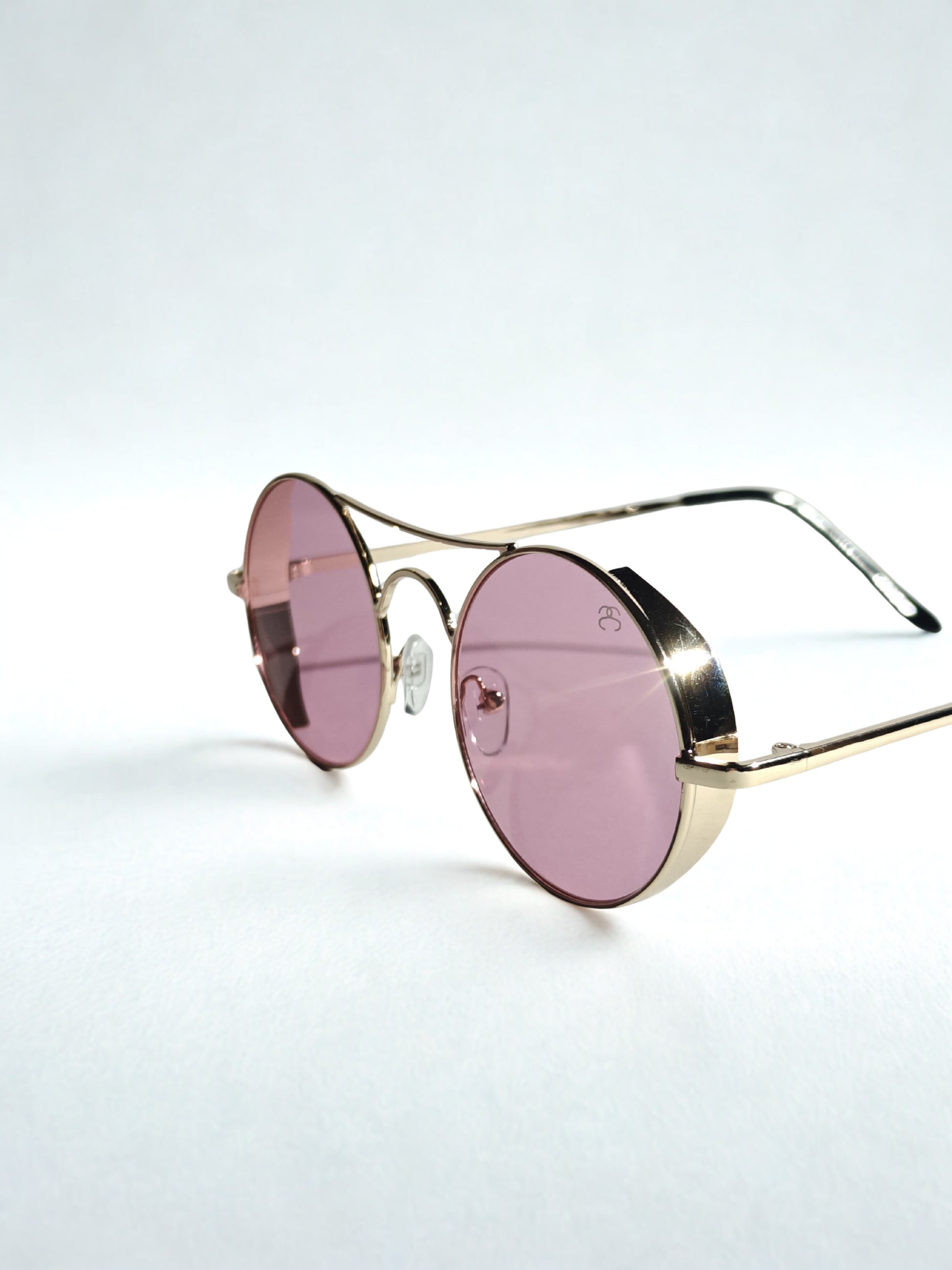 Su silueta redonda, con estructura dorada pulida y lentes en tono rosa imperial, fusiona la riqueza de lo clásico con la rebeldía moderna. No es un accesorio: es una señal. Un gesto de poder suave pero irrefutable.